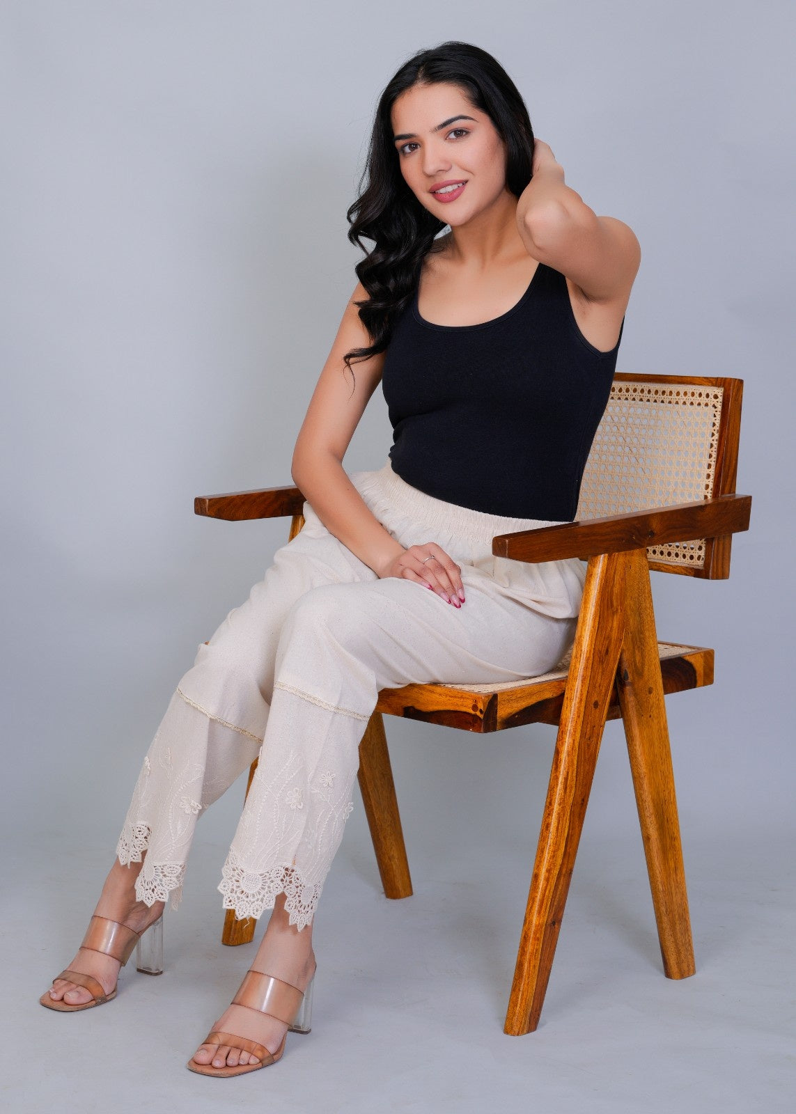 Khadi Designer bottoms - Bottoms & beyond present collection of trousers with great comfort & style. These khadi trousers have an elasticated waist with different type of 3-D work at bottom Team these pair with a contrasting kurtis & tunics. Ezee wash in cold water.