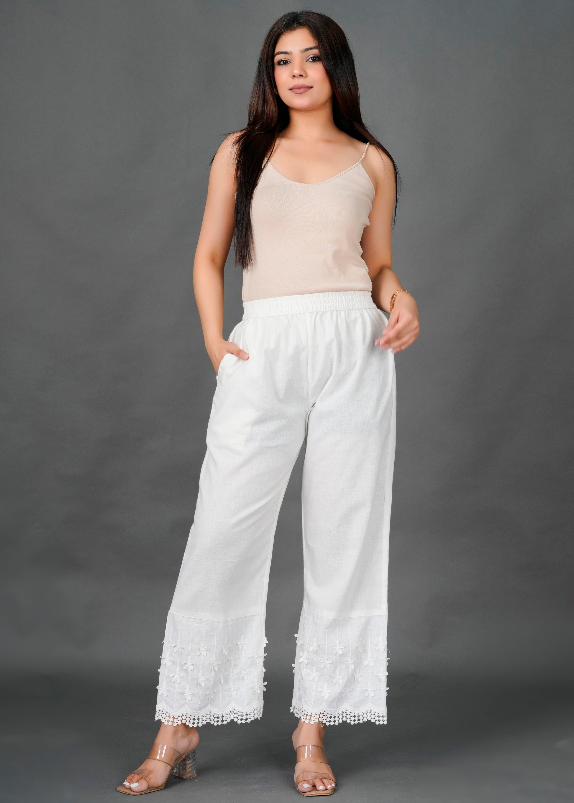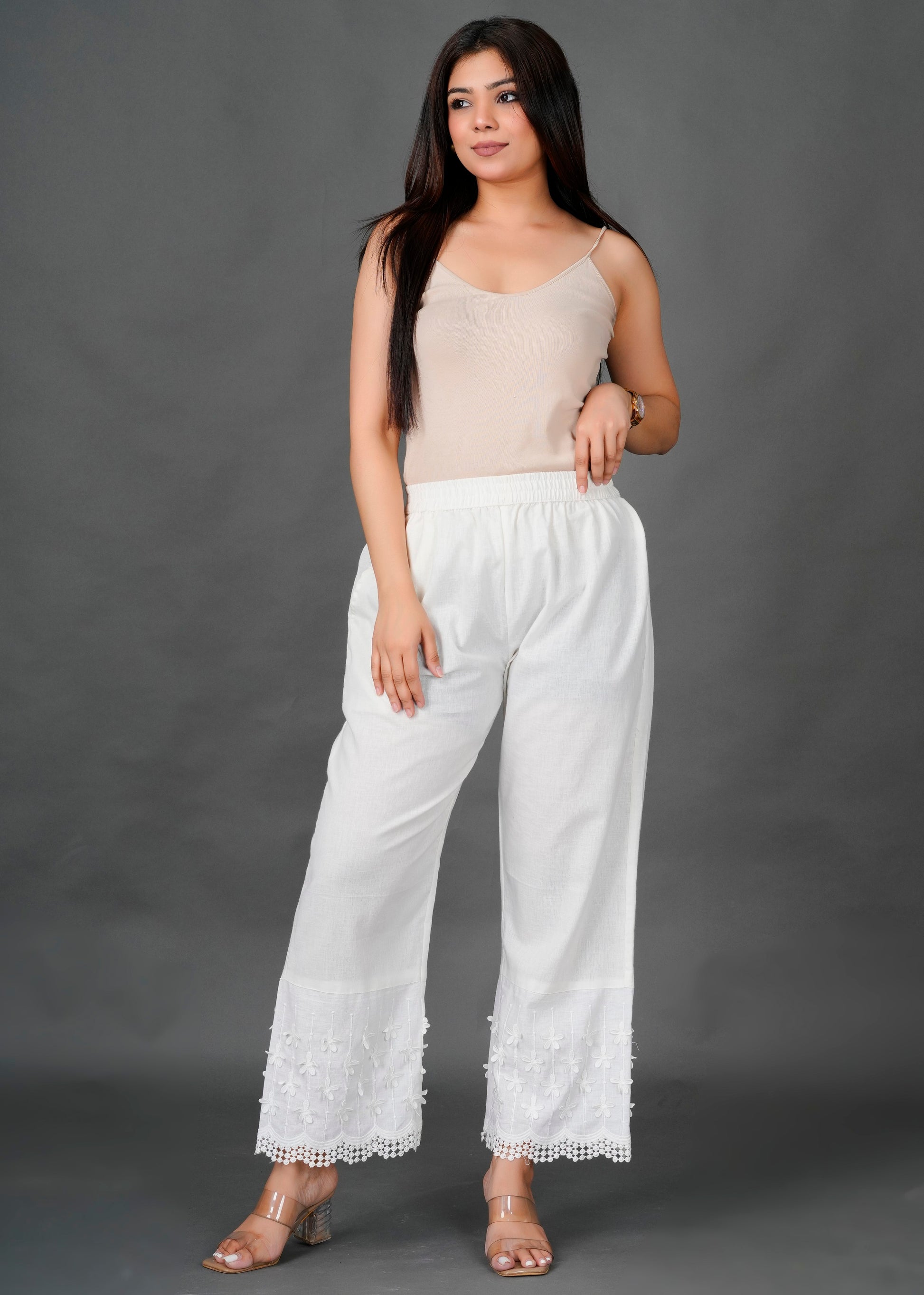 Step into effortless elegance with our White 3D Pant, designed for comfort and style. Crafted from lightweight fabric, this pant features a relaxed fit with an elastic waistband for all-day ease. The standout detail is the beautifully embroidered 3D floral design at the hem, adding a touch of sophistication and charm to your look.