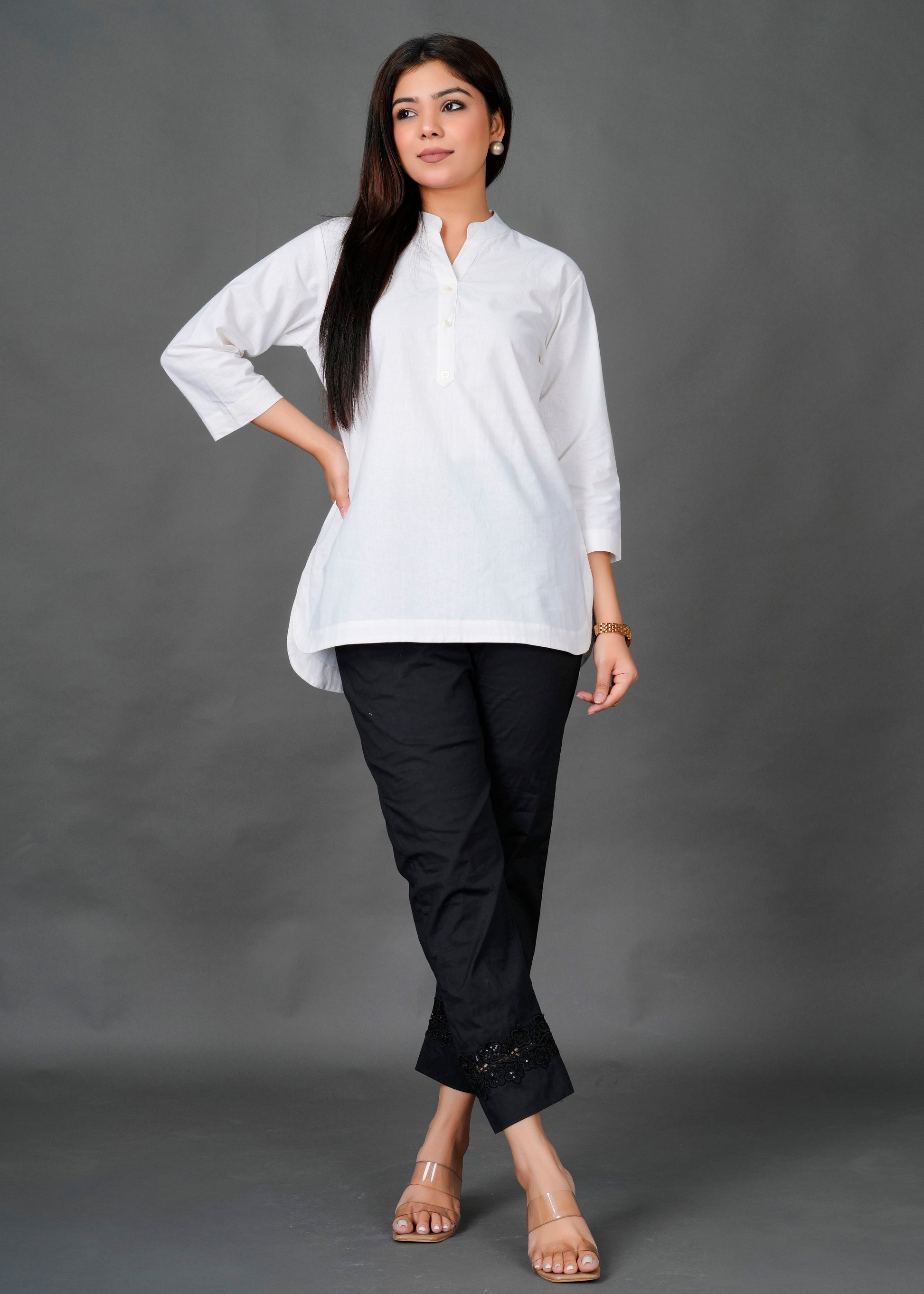 Keep it elegant and versatile with this white kurti paired with stylish black lace pants. The kurti’s clean and classic design brings a touch of sophistication, while the black lace pants add a modern and chic vibe. Perfect for office wear, casual outings, or small gatherings, this monochrome combo ensures comfort with effortless style.