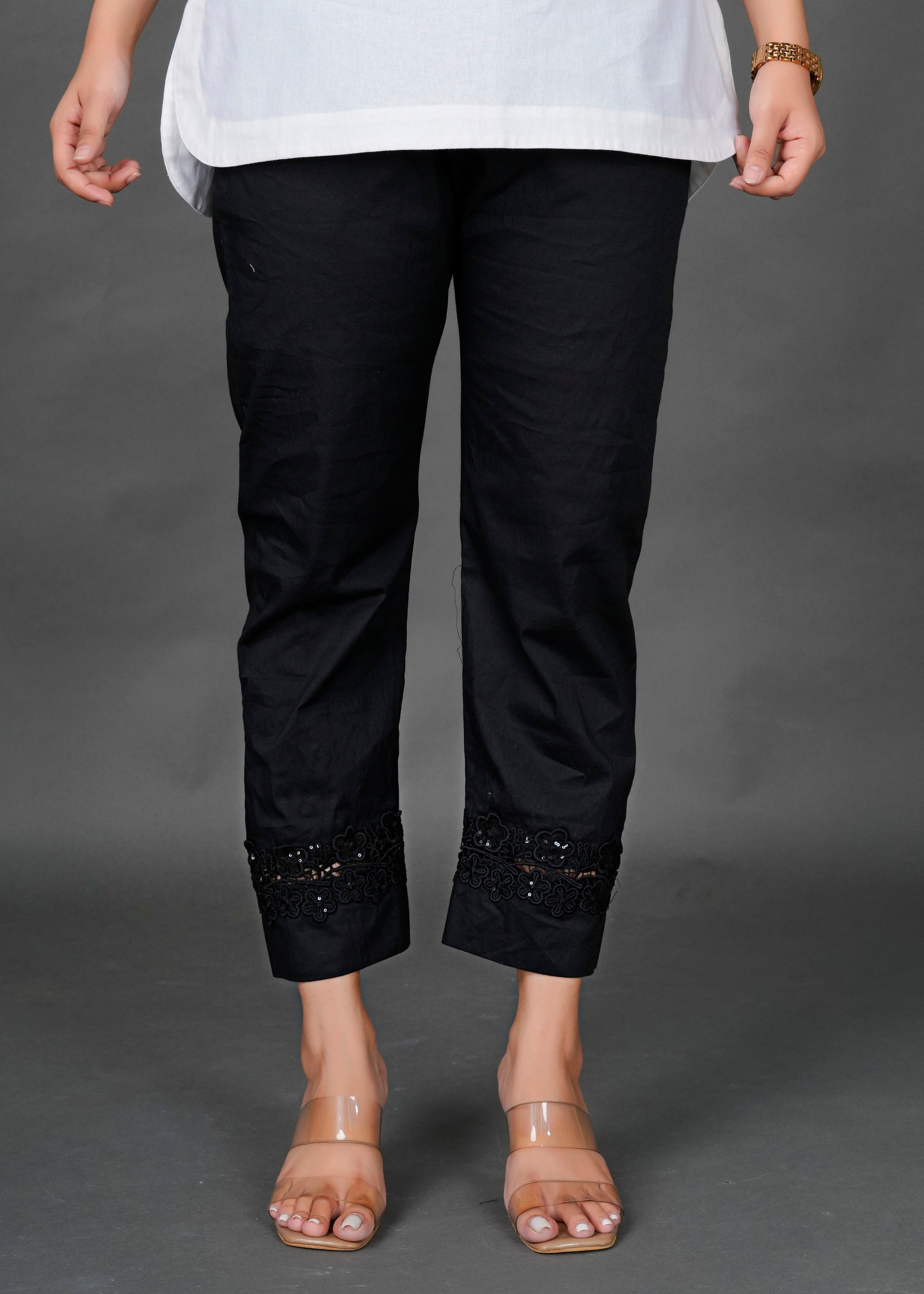 Elevate your everyday style with our Black Lace Pant, a perfect blend of comfort and elegance. Designed with a relaxed fit and an easy elastic waistband, these pants ensure effortless wear all day long. The highlight is the delicate lace embroidery at the hem, adding a graceful and feminine touch to your outfit.